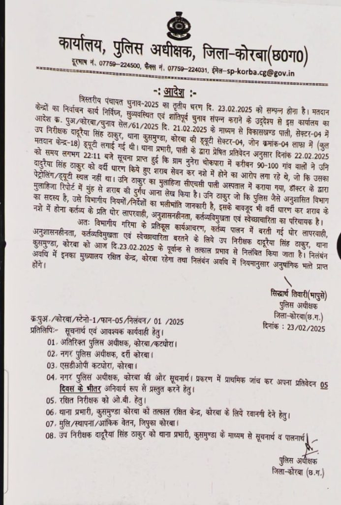कोरबा:- चुनाव ड्यूटी पर शराब के नशे में पकड़ाया उप निरीक्षक, एसपी ने किया सस्पेंड