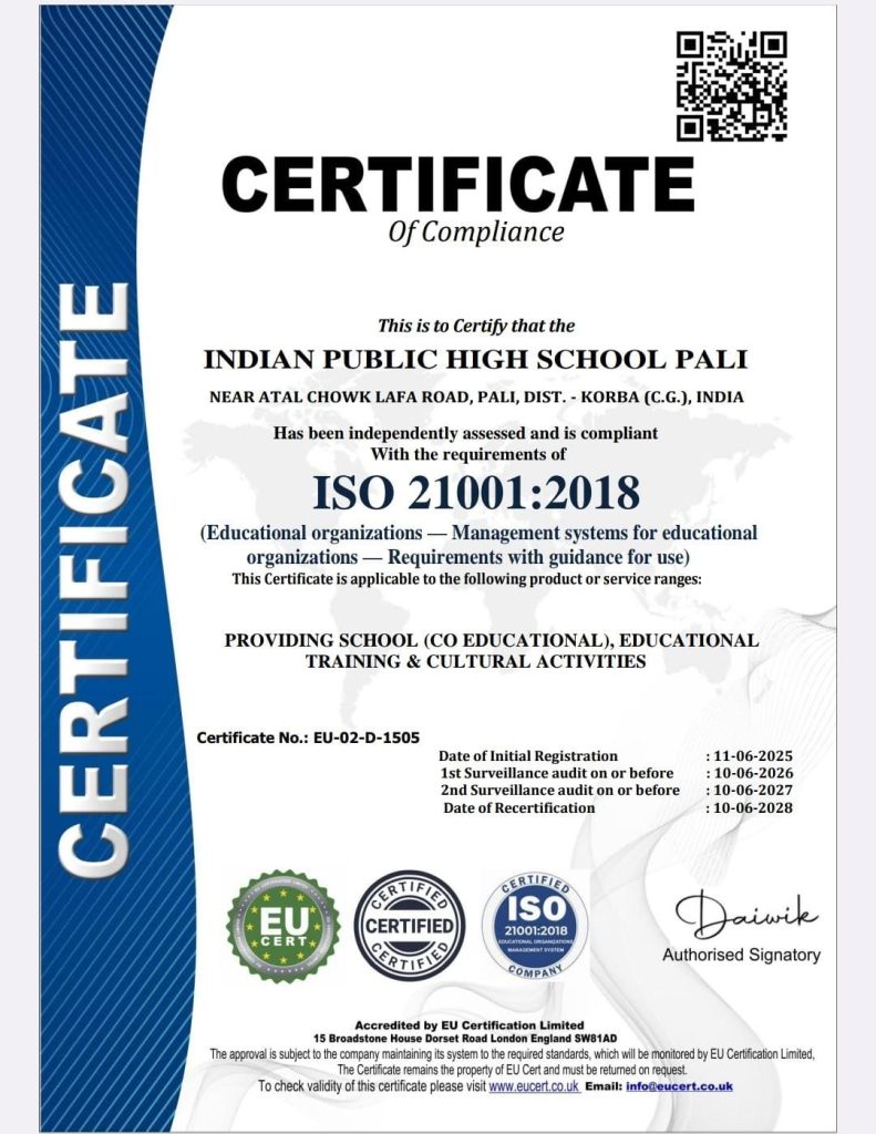 कोरबा/पाली:- शिक्षा को समाज के विकास का नींव माना जाता है। यह न केवल व्यक्तिगत विकास के लिए आवश्यक है, बल्कि एक राष्ट्र की समृद्धि और प्रगति के लिए भी महत्वपूर्ण होती है। शिक्षा ही किसी भी समाज को सभ्य बनाती है और इसी से ही व्यक्ति व समाज का कल्याण होता है। यह कहना अनुचित न होगा कि आधुनिकता की अंधी दौड़ में गुणवत्तापूर्ण शिक्षा की आवश्यकता और इसका महत्त्व बढ़ गया है। शासकीय, निजी स्कूलों में शिक्षा का स्तर सुधारने और बेहतर शिक्षा उपलब्ध कराने के लिए कई प्रयास किये जा रहे है, जिनमे से एक अंग्रेजी माध्यम का इंडियन पब्लिक स्कूल है, जिसने गुणवत्ता प्रबंधन प्रणाली शिक्षण मामले में उत्कृष्टता के क्षेत्र में इतिहास रचते हुए आईएसओ प्रमाणित विद्यालय का गौरव प्राप्त किया है।