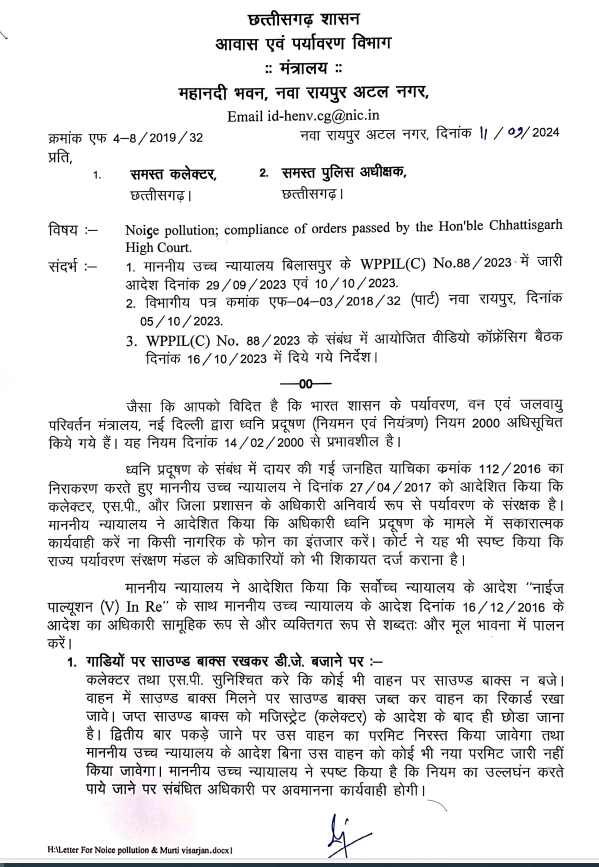 रायपुर/ छत्तीसगढ़ में डीजे को लेकर SC के निर्देश पर राज्य सरकार ने नई गाइडलाइन जारी की है. अब डीजे लगाने वाली गाड़ियों का परमिट निरस्त किया जाएगा. नई गाइडलाइन का सख्ती से पालन करने सभी कलेक्टर औ एसपी को निर्देश दिए गए हैं. बता दें कि डीजे और ध्वनि प्रदूषण को लेकर उच्च न्यायालय ने 2017 में सख्त आदेश देते हुए गाइडलाइन जारी की थी, मगर उसका कड़ाई से पालन नहीं हो रहा था.
