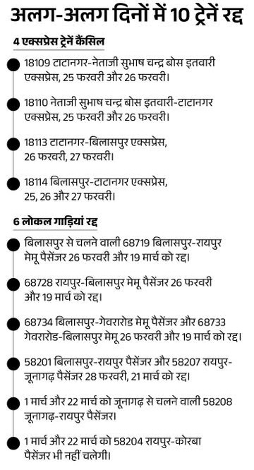 बिलासपुर/ रायपुर रेल मंडल के बैकुंठ-सिलयारी स्टेशन के बीच पावर ब्लॉक लेकर गर्डर लॉन्चिंग का काम किया जाएगा। इस वजह से अलग-अलग दिनों में 6 लोकल और 4 एक्सप्रेस ट्रेनों को कैंसिल किया गया है। इनमें टाटानगर-बिलासपुर एक्सप्रेस शामिल हैं। 26 और 28 फरवरी को बिलासपुर-रायपुर के साथ ही गेवरारोड मेमू पैसेंजर रद्द रहेगी। वहीं 26 फरवरी और 19 मार्च को गोंदिया और झारसुगुड़ा से चलने वाली 68861/68862 गोंदिया-झारसुगुड़ा-गोंदिया मेमू पैसेंजर बिलासपुर और गोंदिया के बीच रद्द रहेगी। लोकल ट्रेनें कैंसिल होने से स्थानीय यात्रियों परेशानियों का सामना करना पड़ेगा। इससे पहले महाकुंभ में भीड़ को देखते हुए छत्तीसगढ़ से प्रयागराज जाने वाली 2 ट्रेनों को कैंसिल किया था। सारनाथ-नौतनवा एक्सप्रेस 28 फरवरी तक नहीं चलेगी।