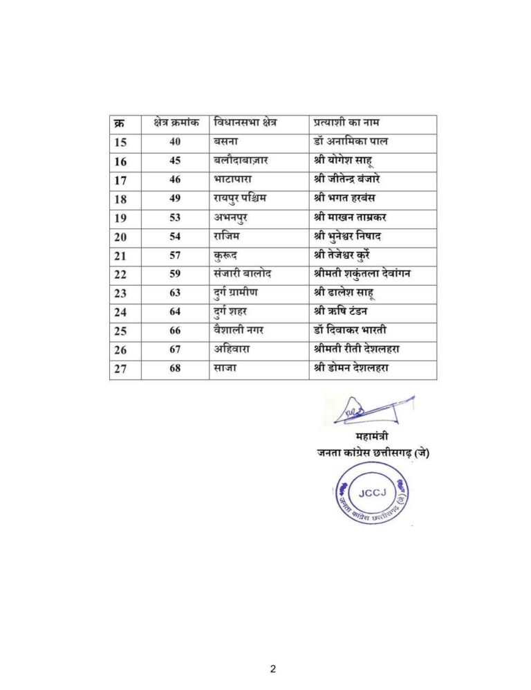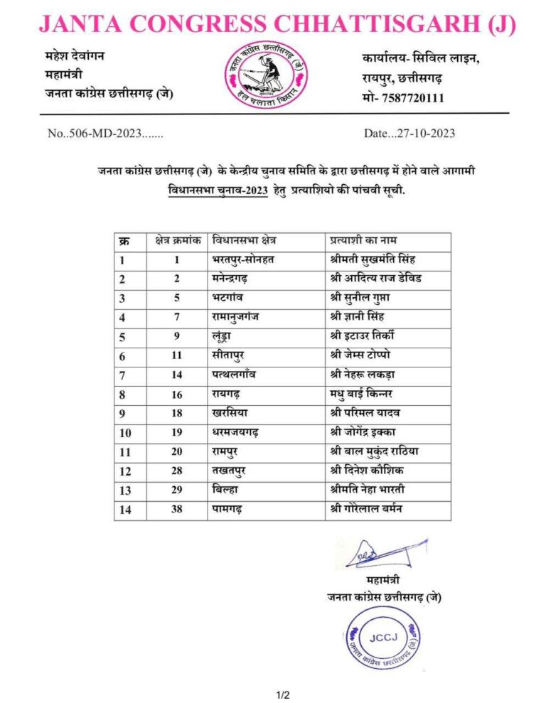 छत्तीसगढ़:-जोगी कांग्रेस ने जारी की 27 प्रत्याशियों की सूची, रामपुर से बालमुकुंद राठिया बनाए गए उम्मीदवार