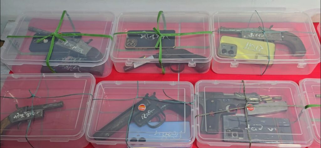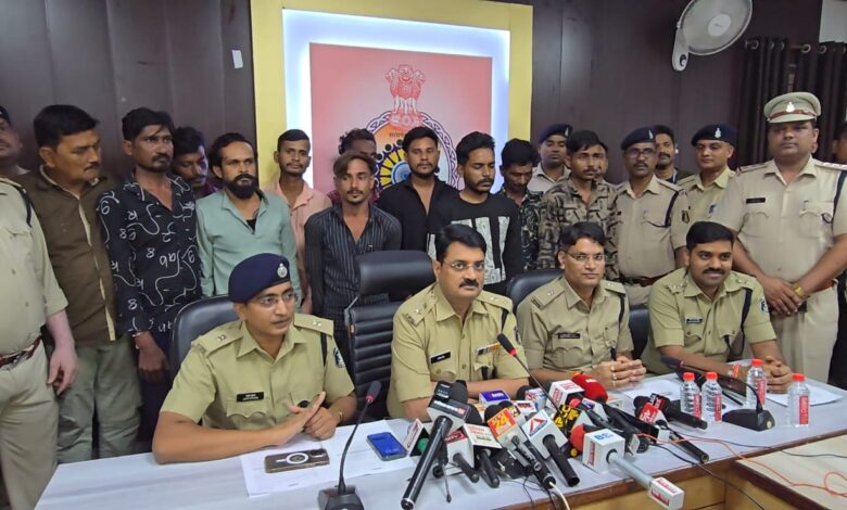 बिलासपुर/ एसबीआई के एटीएम में डकैती की योजना बनाने वाले 11 आदतन अपराधियों को पुलिस ने गिरफ्तार किया है, इनके पास से 1 पिस्टल, 6 देशी कट्टा, 2 मैगजीन, 10 जिंदा कारतूस, 1 तलवार, 1 चाकू, 2 नग फरसा, 10 मोबाइल बरामद किया गया है। पूरे मामले का एसपी रजनेश सिंह ने खुलासा किया सभी आदतन अपराधियों के खिलाफ शहर के विभिन्न स्थानों में एक दर्जन से अधिक मामले दर्ज हैं.
