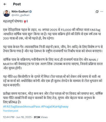 गडकरी ने अपने X पोस्ट में बताया कि एनुअल पास के एक्टिवेशन और रिन्युएबल के लिए जल्द ही राजमार्ग यात्रा एप और NHAI / MoRTH की वेबसाइट्स पर एक अलग लिंक उपलब्ध कराया जाएगा, जिससे यह प्रोसेस और आसान हो जाएगी।