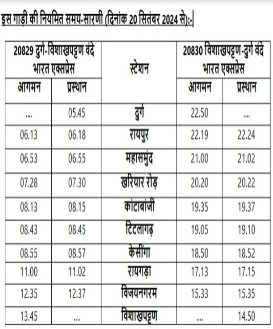 बिलासपुर/ प्रधानमंत्री नरेंद्र मोदी 16 सितंबर 2024 को दुर्ग- विशाखापट्टनम वंदे भारत एक्सप्रेस का वर्चुअल शुभारंभ करेंगे। यह कार्यक्रम वीडियो कॉन्फ्रेंसिंग के माध्यम से आयोजित होगा। वंदे भारत (20829/20830) एक्सप्रेस दुर्ग से विशाखापट्टनम तक सप्ताह में छह दिन संचालित की जाएगी, केवल गुरुवार को छोड़कर।