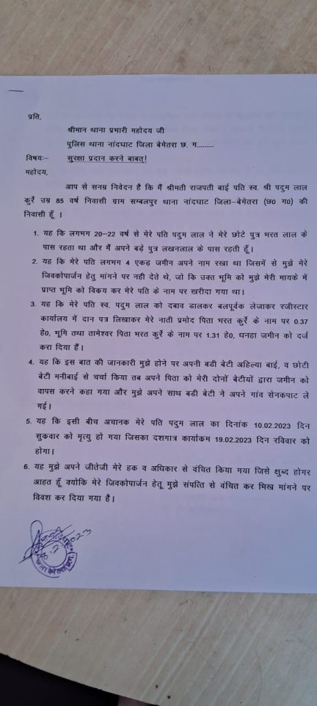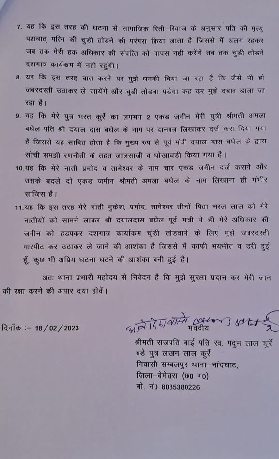 राजपति ने पत्र में उल्लेख किया है कि , उसके नाती मुकेश, प्रमोद, तामेश्वर तीनों को सामने लाकर दयालदास बघेल पूर्व मंत्री ने उसके अधिकार की जमीन को हड़प कर दशगात्र कार्यक्रम में चूड़ी तुड़वाने के लिए उस पर जबरदस्ती मारपीट कर उठाकर ले जाने की आशंका है। जिससे वह काफी डरी हुई हैं इसलिए राजपती ने पुलिस प्रशासन से सुरक्षा की मांग की है।