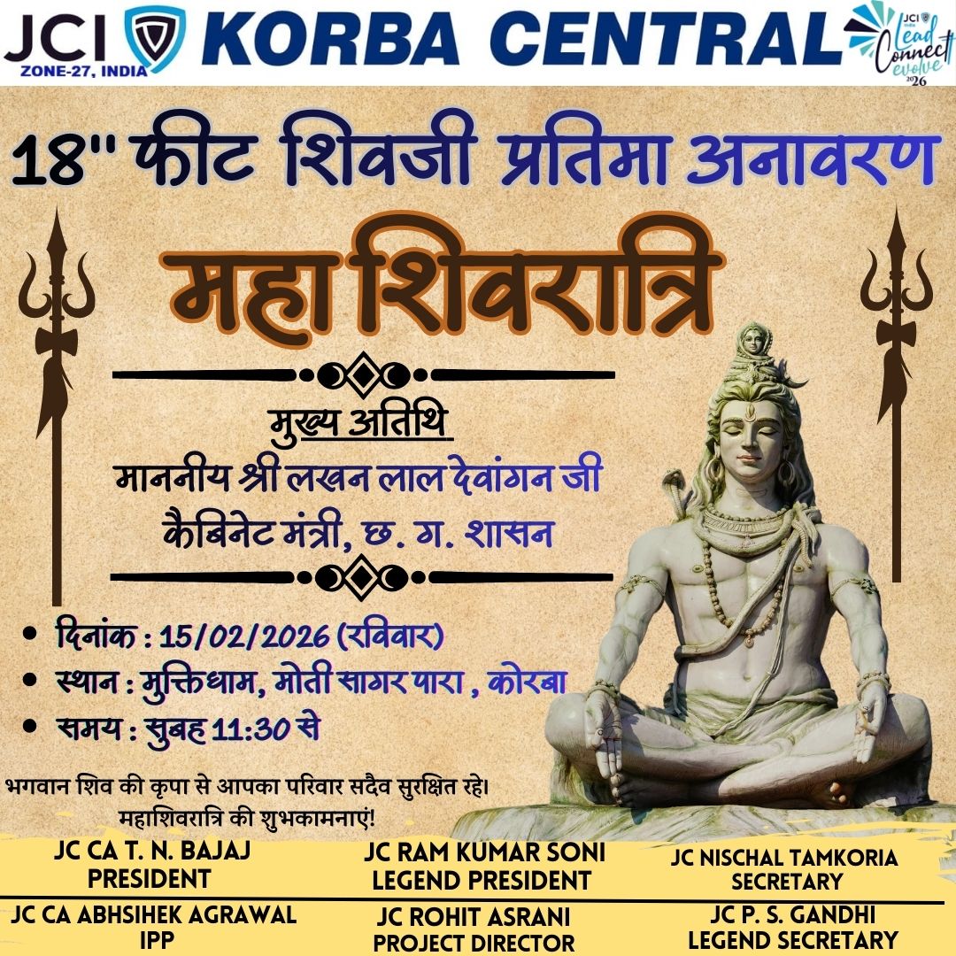 औद्योगिक नगरी कोरबा में इस वर्ष महाशिवरात्रि का पर्व बेहद खास होने जा रहा है। जेसीआई जोन-27 (भारत) की प्रतिष्ठित शाखा जेसीआई कोरबा सेंट्रल द्वारा सामाजिक और धार्मिक सरोकार के तहत मुक्तिधाम, मोती सागर पारा में 18 फीट ऊंची भगवान शिव की विशाल प्रतिमा स्थापित की गई है, जिसका भव्य अनावरण आगामी रविवार को किया जाएगा।