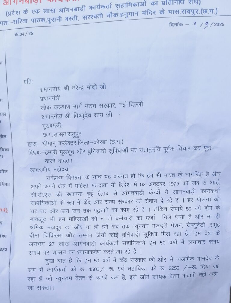 छत्तीसगढ़ की करीब एक लाख आंगनबाड़ी कार्यकर्ता-सहायिकाओं ने प्रांतीय आह्वान पर 1 सितम्बर को प्रदेश के सभी जिला मुख्यालयों में धरना, सभा और रैली आयोजित कर सरकार का ध्यान आकर्षित किया। आंगनवाड़ी कार्यकर्ता सहायिका संयुक्त मंच छत्तीसगढ़ के बैनर तले कोरबा के आईटीआई तानसेन चौक पर धरना उपरांत रैली की शक्ल में कलेक्ट्रेट पहुंचकर जिला कलेक्टर के माध्यम से प्रधानमंत्री व छत्तीसगढ़ के मुख्यमंत्री के नाम ज्ञापन सौंपकर अपनी मांगें रखीं।