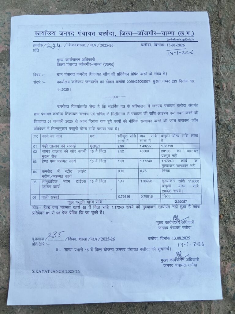 जिले के बलौदा विकासखंड अंतर्गत ग्राम पंचायत कमरिद में सचिव और सरपंच पर लाखों रुपये के गबन का गंभीर आरोप सामने आया है। आरोप है कि ग्राम पंचायत कमरिद की सरपंच के पति राजकुमार धीरही द्वारा शासकीय योजनाओं के तहत निकाली गई राशि का दुरुपयोग किया गया। पंचायत के पंचों ने इस संबंध में शिकायत दर्ज कराई है।
