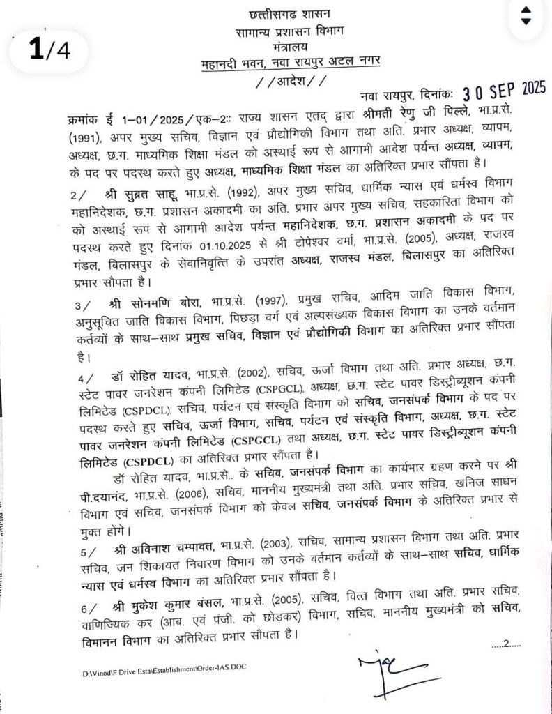 छत्तीसगढ़ शासन, सामान्य प्रशासन विभाग ने दिनांक 30 सितंबर 2025 को राज्य के भारतीय प्रशासनिक सेवा (IAS) के अधिकारियों के प्रभारों में व्यापक फेरबदल और नई पदस्थापनाएं की हैं।
