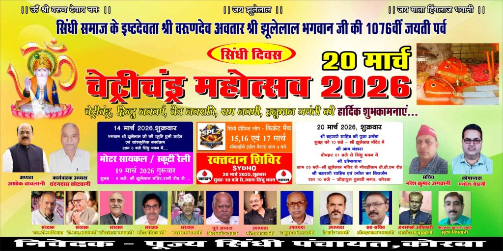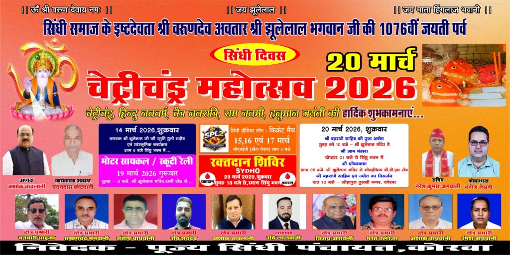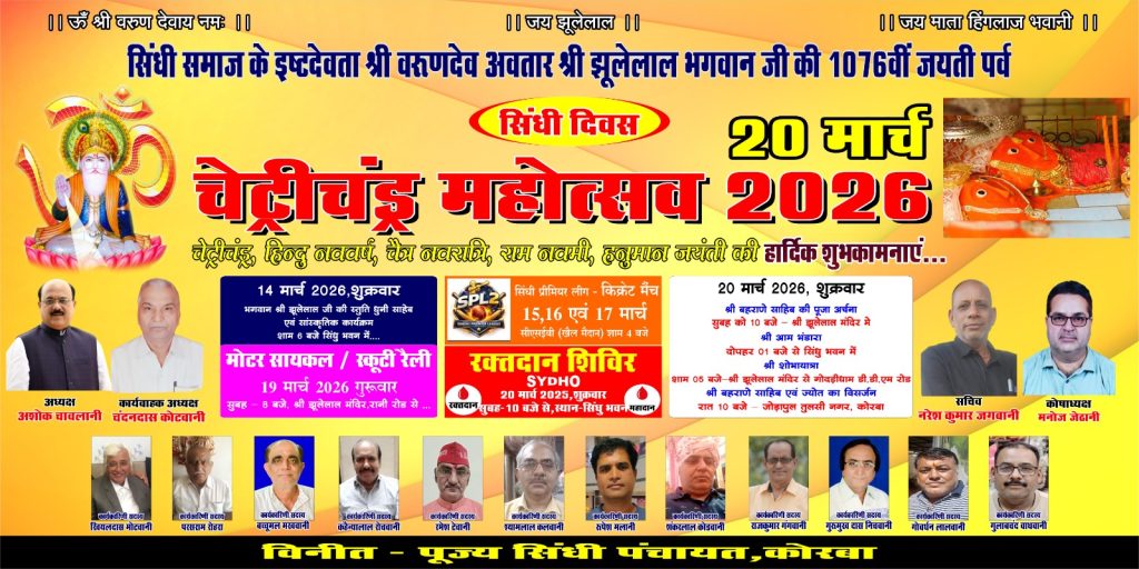 कोरबा। पूज्य सिंधी पंचायत कोरबा द्वारा सिंधी समाज के आराध्य देव भगवान झूलेलाल जी के अवतरण दिवस के उपलक्ष्य में चेटीचंद्र महोत्सव का आयोजन 14 मार्च से प्रारंभ होकर 20 मार्च तक धूमधाम से किया जा रहा है। हर वर्ष की तरह इस वर्ष भी समाज द्वारा भगवान झूलेलाल का जन्म महोत्सव हर्षोल्लास और श्रद्धा के साथ मनाने का निर्णय लिया गया है। इस अवसर पर विभिन्न धार्मिक, सामाजिक और सांस्कृतिक कार्यक्रम आयोजित किए जाएंगे, जिनमें महिला विंग, युवा विंग, सिंधी पंचायत सहित कई सामाजिक संस्थाओं का सहयोग रहेगा।पंचायत के अध्यक्ष अशोक चावलानी एवं सचिव नरेश जगवानी ने जानकारी देते हुए बताया कि महोत्सव की शुरुआत 14 मार्च को रानी रोड स्थित सिंधु भवन में शाम 6 बजे भगवान झूलेलाल जी की धूनी साहब के आयोजन से हुई। इसके पश्चात आरती और भंडारे का आयोजन भी किया गया। धूनी साहब के साथ ही चेटीचंद्र महोत्सव का शुभारंभ हुआ।महोत्सव के अंतर्गत 15, 16 और 17 मार्च को शाम 4 बजे से सीएसईबी खेल मैदान में एसपीएल-2 क्रिकेट प्रतियोगिता का आयोजन किया जा रहा है, जिसमें समाज के युवा बढ़-चढ़कर भाग लेंगे। 16 मार्च को होने वाले विशेष मैच में युवतियां भी भाग लेंगी, जो इस आयोजन का खास आकर्षण रहेगा।