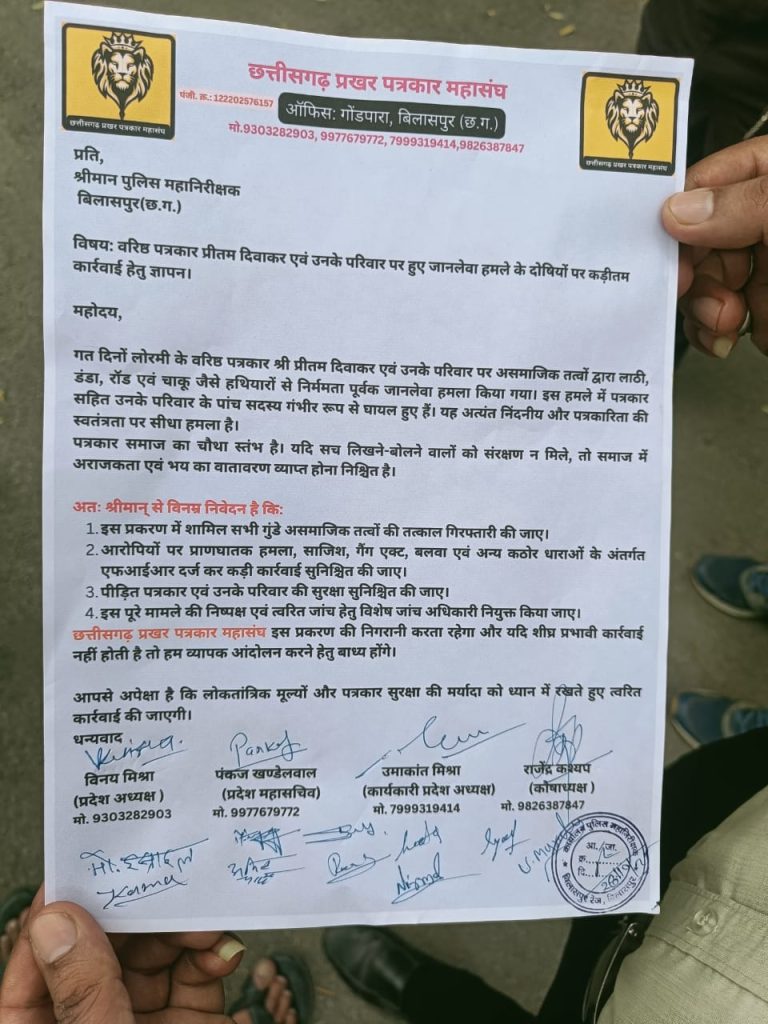 बिलासपुर -छत्तीसगढ़ प्रखर पत्रकार महासंघ ने गत दिनों लोरमी के वरिष्ठ पत्रकार प्रीतम दिवाकर एवं उनके परिवार पर असमाजिक तत्वों द्वारा लाठी, डंडा, रॉड एवं चाकू जैसे हथियारों से निर्ममता पूर्वक जानलेवा हमला किया गया। इस हमले में पत्रकार सहित उनके परिवार के पांच सदस्य गंभीर रूप से घायल हुए हैं। पत्रकार महासंघ कहा कि यह अत्यंत निंदनीय और पत्रकारिता की स्वतंत्रता पर सीधा हमला है।