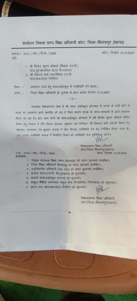 बिलासपुर।ग्राम पंचायत कोनचरा (ब्लॉक कोटा, तहसील बेलगहना) में शासकीय उच्च माध्यमिक विद्यालय में विषयवार शिक्षकों की कमी को लेकर आज छत्तीसगढ़िया क्रांति सेना के कार्यकर्ताओं और ग्रामवासियों ने एक दिवसीय शांतिपूर्ण धरना प्रदर्शन किया।