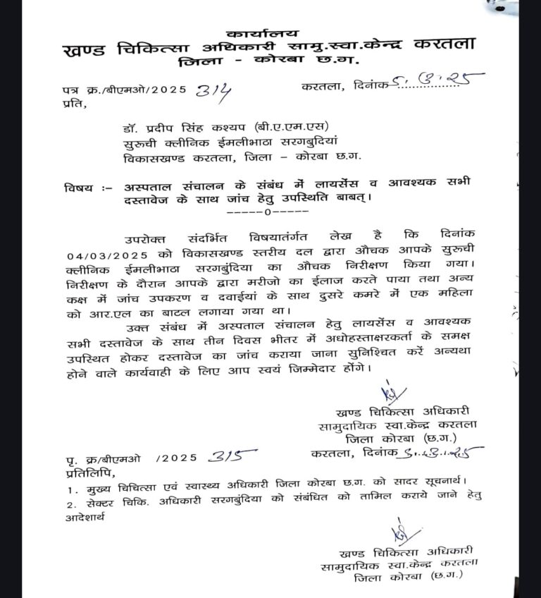 मामला करतला विकासखंड के अमलीभांठा गांव का है, जहाँ पर एक बी ए एम एस डॉ. प्रदीप कश्यप द्वारा सुरुचि क्लिनिक के नाम पर पूरा अस्पताल चलाया जा रहा है। डॉ. प्रदीप कश्यप एक आयुर्वेद डिग्रीधारी डॉक्टर है किंतु उसके द्वारा एलोपैथी पद्धति से मरीजों का ईलाज किया जाता है। इतना ही नहीं उसके द्वारा अपने क्लीनिक को पूरे अस्पताल का स्वरूप देकर रखा गया है। उसके क्लीनिक में मरीजों को भर्ती करने की सुविधा है, खून जांच किया जाता है यहाँ तक कि मरीजों को भर्ती कर खून भी चढ़ाया जाता है।