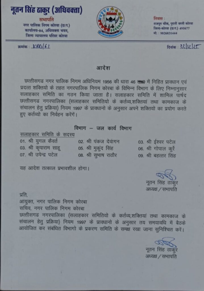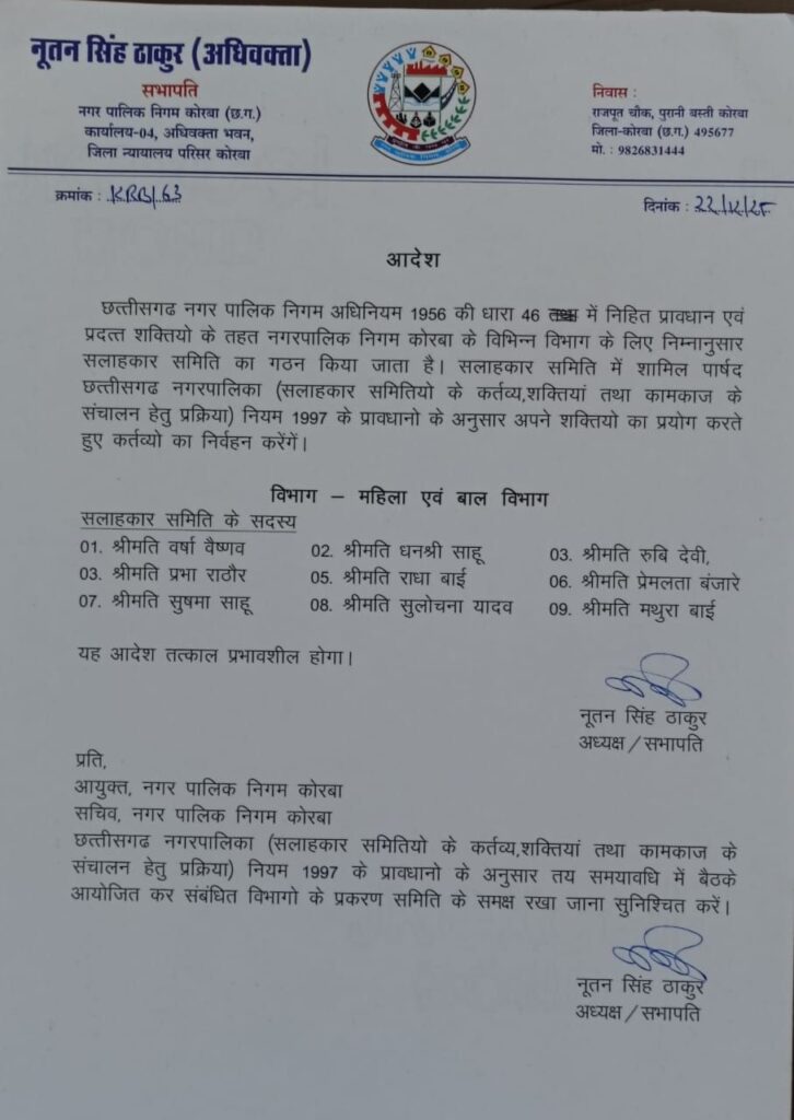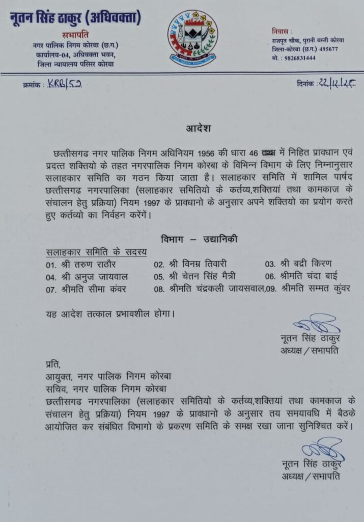कोरबा। नगर पालिका निगम कोरबा के सभापति व अध्यक्ष नूतन सिंह ठाकुर ने छत्तीसगढ़ नगर निगम अधिनियम के तहत विभिन्न सलाहकार समितियां का गठन किया है। निगम सभापति नूतन सिंह ठाकुर ने इससे पहले भी दो समितियां का गठन किया था, इस बार चार विभागों के लिए गठित समितियां में 36 पार्षदों को स्थान दिया गया है जिसमें भाजपा, कांग्रेस और निर्दलीय पार्षद शामिल हैं।निगम अध्यक्ष नूतनसिंह ठाकुर द्वारा अधिनियम की धारा 46 के तहत आदेश जारी कर उद्यानिकी विभाग के सलाहकार समिति में तरुण राठौर, विनम्र तिवारी, बद्री किरण, अनुज जायसवाल, चेतन सिंह मैत्री, चंदाबाई, सीमा कंवर, चंद्रकाली जायसवाल,सम्मत कुंवर कों शामिल किया गया है। इसी प्रकार जल कार्य विभाग समिति में युगल कैवर्त , पंकज देवांगन, ईश्वर पटेल, कृपाराम साहू, मुकुंद सिंह कंवर, गोपाल कुर्रे, उपेंद्र पटेल, सुभाष राठौड़ और बहत्तर सिंह शामिल किए गए हैं। महिला एवं बाल विभाग समिति में निगम के महिला पार्षदों को शामिल कर समिति बनाया गया है जिसमें वर्षा वैष्णव, धनश्री साहू, रूबी देवी, प्रभा राठौर, राधाबाई, प्रेमलता बंजारे, सुषमा साहू, सुलोचना यादव, मथुरा बाई को शामिल है। संस्कृति एवं पर्यटन विभाग समिति में राधा महंत, सुखसागर निर्मलकर, राकेश वर्मा, रामाधार पटेल,रजत खुटे,रामकुमार साहू, सिमरनजीत कौर, सुखविंदर कौर, सुनीता चौहान को शामिल करते हुए समिति गठित की गई है।