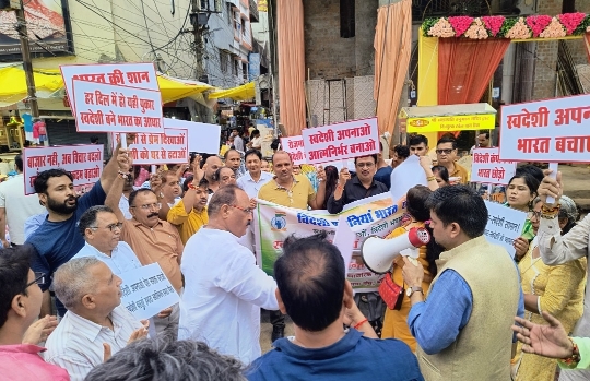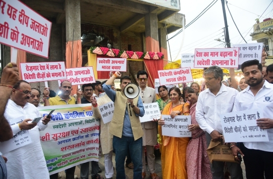 भोपाल — स्वदेशी जागरण मंच ने रविवार को “स्वदेशी, सुरक्षा एवं स्वावलंबन अभियान” के अंतर्गत न्यू मार्केट में विदेशी कंपनियों को भारत छोड़ने तथा अमेरिका द्वारा भारत पर लगाए गए टैरिफ के खिलाफ जोरदार विरोध प्रदर्शन किया। इस अवसर पर जनजागरण रैली निकाली गई और उपस्थित नागरिकों ने स्वदेशी अपनाने का संकल्प लिया।
