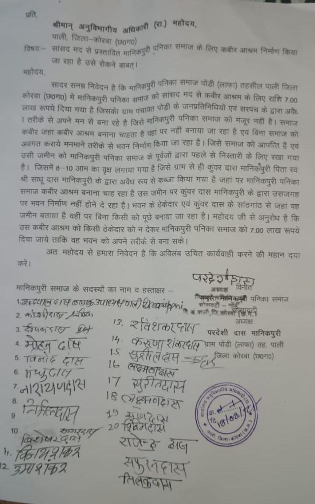 पाली / मानिकपुरी पनिका समाज, ग्राम पोड़ी (लाफा), तहसील पाली द्वारा सांसद मद से स्वीकृत ₹7.00 लाख की राशि से प्रस्तावित कबीर आश्रम निर्माण में की जा रही अनियमितताओं के खिलाफ आवाज़ उठाई गई है। समाज का आरोप है कि ग्राम पंचायत पोंडी के जनप्रतिनिधि व सरपंच द्वारा आश्रम निर्माण कार्य को बिना समाज की सहमति एवं जानकारी के मनमाने ढंग से शुरू करवा दिया गया है।