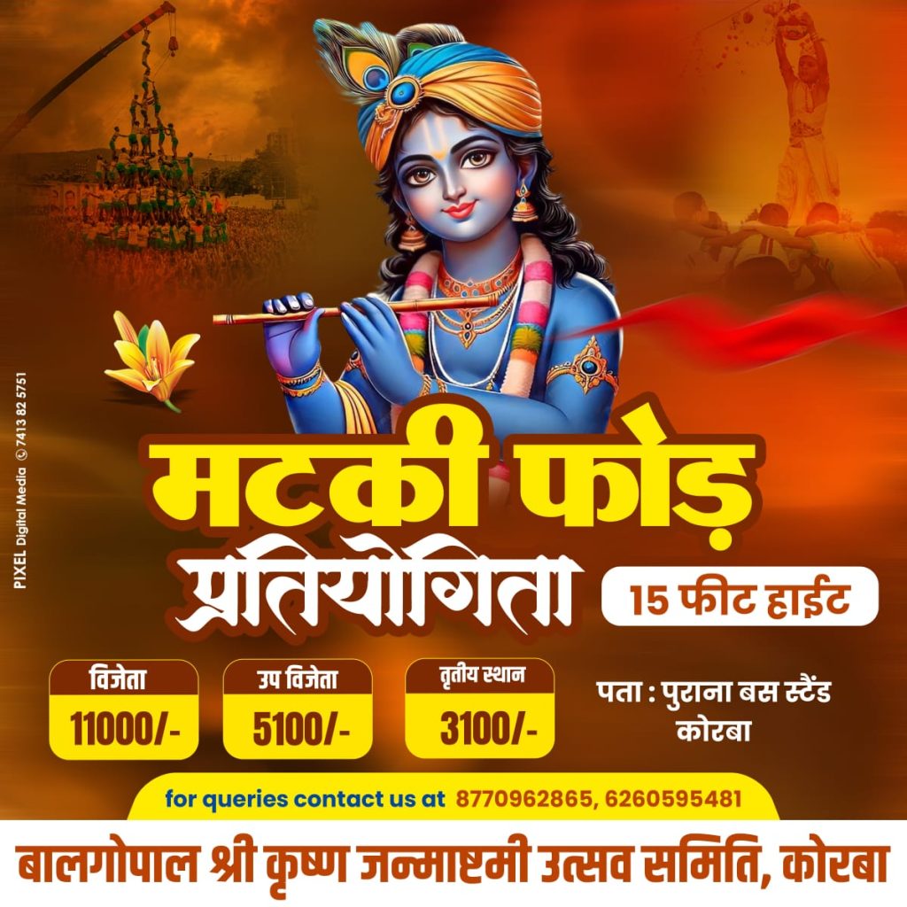 कोरबा।बालगोपाल श्री कृष्ण जन्माष्टमी उत्सव समिति कोरबा द्वारा आगामी 16 अगस्त को पुराना बस स्टैंड कोरबा में पहली बार भव्य मटका फोड़ प्रतियोगिता का आयोजन किया जाएगा। शाम 6 बजे से शुरू होने वाले इस कार्यक्रम में 15 फीट ऊँचाई पर लटकी मटकी को फोड़ने के लिए टीमें अपनी ताकत और रणनीति दिखाएंगी।विजेता टीम को ₹11,000, उपविजेता को ₹5,100 और तृतीय स्थान पर आने वाली टीम को ₹3,100 का नगद पुरस्कार प्रदान किया जाएगा।कार्यक्रम में मुख्य अतिथि होंगे श्री नूतनसिंह ठाकुर (सभापति, नगर पालिका निगम कोरबा) और विशिष्ट अतिथियों में श्री सुरेन्द्र प्रताप जायसवाल(कार्यसमिति सदस्य, छ ग प्रदेश कांग्रेस कमेटी), श्रीमती सुलोचना भोलू यादव(पार्षद वार्ड नं 12 नपानी कोरबा), श्री टामेश अग्रवाल(पार्षद वार्ड नं 5 नपानी कोरबा) और श्री तेजप्रताप सिंह शामिल होंगे।(पार्षद बाक़ीमोगरा,कोरबा)आयोजकों ने कोरबा व आसपास के क्षेत्र के नागरिकों से आग्रह किया है कि वे परिवार सहित पहुँचकर इस धार्मिक व सांस्कृतिक उत्सव का आनंद लें। एवं कार्यक्रम में बढ़चढकर हिस्सा ले