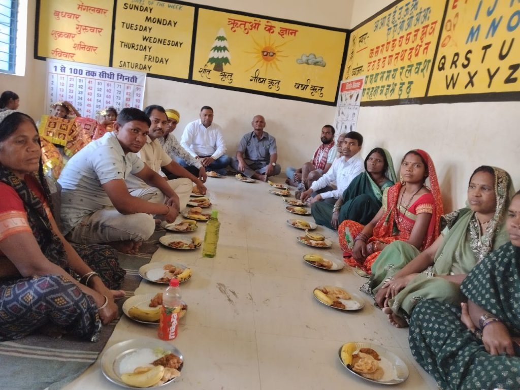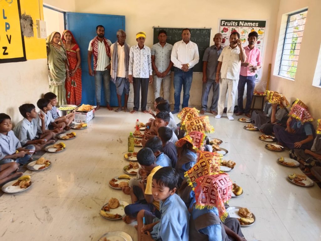 बच्चों को खीर, पुड़ी, भजिया, केला एवं मिठाई परोसी गई, जिसे पाकर वे अत्यंत खुश नजर आए।