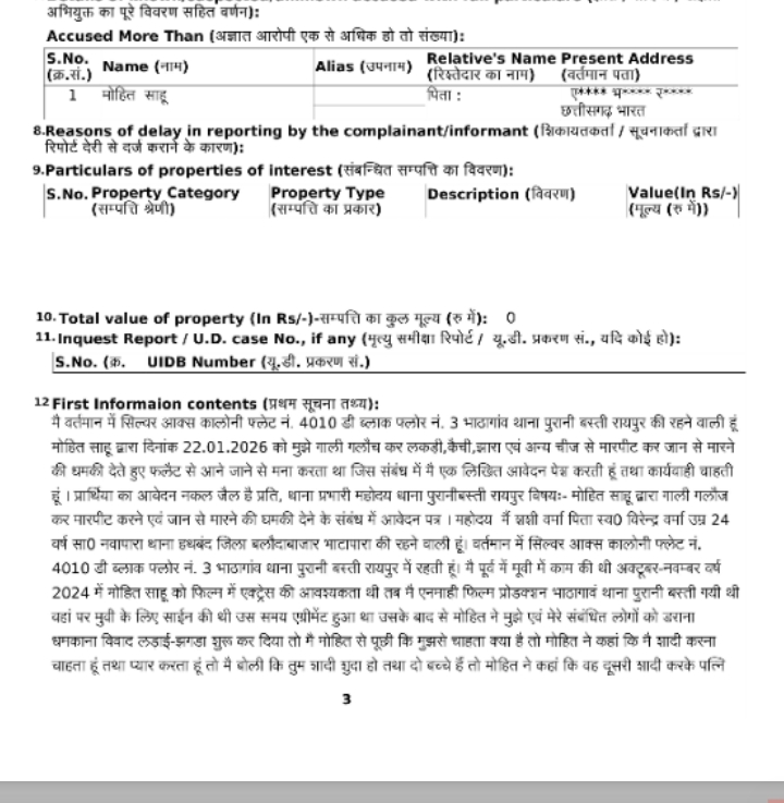 राजधानी रायपुर में छत्तीसगढ़ी फिल्मों के निर्माता और अभिनेता मोहित साहू पर एक्ट्रेस के साथ मारपीट करने का गंभीर मामला सामने आया है। इस संबंध में पीड़िता ने रायपुर के पुरानी बस्ती थाना में शिकायत दर्ज कराई है। शिकायत में कहा गया है कि मोहित साहू ने युवती को शादी के बहाने उज्जैन ले जाकर जबरन शादी के लिए मजबूर किया, लेकिन बाद में वह शादी से मुकर गया। इस दौरान कथित तौर पर उसने युवती पर मारपीट की और कैंची, झारा जैसी ठोस वस्तुओं से हमला किया।