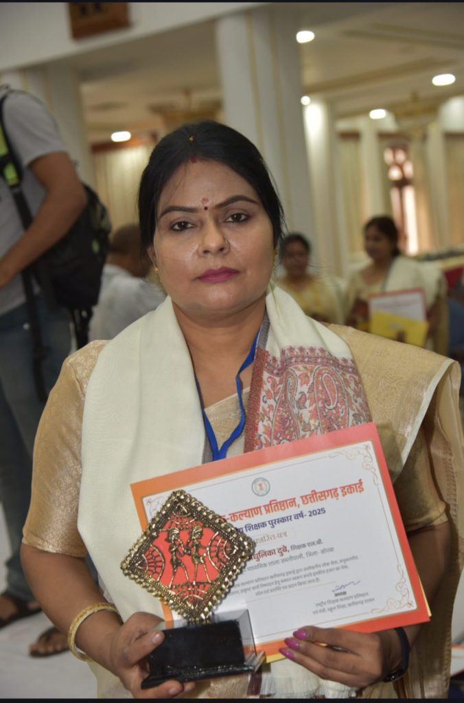 कोरबा : शिक्षिका मधुलिका दूबे के समर्पण और मेहनत ने करतला ब्लॉक के शासकीय मा.शा.जमनीपाली को एक नई पहचान दिलाई है। छत्तीसगढ़ टीचर्स एसोसिएशन के महिला मोर्चा के कोरबा जिला प्रभारी भी है।शिक्षिका ने अपनी कला के माध्यम से बच्चों को अनुपयोगी वस्तुओं का उपयोग करना सिखाया।अपनी निरंतर प्रयास,,लगन और नावाचारी गतिविधि के माध्यम से शाला परिवेश में महत्वपूर्ण बदलाव ले आई।स्कूल की दीवारों को अपने कला कौशल के द्वारा रंग रोगन कर विभिन्न कलाकृतियाँ बनवाई।जिससे स्कूल का नजारा किसी प्ले स्कूल जैसे लगने लगा.।ऐसे शाला परिवेश और टूल्स को देखकर बच्चे आकर्षित हुए।जिससे शाला में उनकी उपस्थिति के साथ ही पढ़ाई में रूचि बढ़ी। विगत दिनों शिक्षिका मधुलिका दूबे को कला कौशल को शिक्षा के क्षेत्र में नवाचार के रूप में उपयोगी बनाने के लिए राजभवन में राज्यपाल महामहिम रमेन डेका जी के हाथों राज्यपाल पुरुष्कार से सम्मानित हुई।शिक्षिका मधुलिका दूबे एक नवाचारी शिक्षिका के साथ छायावादी कवियत्री भी हैं.।शिक्षिका को पहले भी उनकी अद्वितीय प्रतिभा के लिए अनेक मंचो से सम्मानित किया जा चूका है।