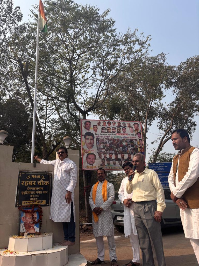 गणतंत्र दिवस पर गणेश नगर रहबर चौक में यू मुरली राव ने फहराया झंडा बिलासपुर/दुर्गेश मरावी गणतंत्र दिवस के पावन अवसर पर वार्ड नंबर 46 गणेश नगर रहबर चौक में 77 वीं गणतंत्र दिवस बहुत ही हर्षोल्लास के साथ मनाया गया, प्रखर पत्रकार महासंघ के जिला मीडिया प्रभारी एवं पूर्व विधायक प्रतिनिधि यु मुरली राव ने झंडा फहराया और संविधान रचयिता डॉक्टर भीमराव अंबेडकर को नमन करते हुए संविधान की मूल उद्देश्य कार्यपालिका विधायिका एवं न्यायपालिका की कार्य प्रणाली और उनकी शक्तियों के बारे में विस्तार से बताया। ध्वजारोहण कार्यक्रम में मुख्य रूप से सुन्नी हनीफी मस्जिद के सदर इमरान साहब, नायब सदर बॉबी भाई, सोशल कांग्रेस ऑर्गेनाइजेशन के अध्यक्ष सैयद मकसूद अली, आबिद अली, समाजसेवी संजीव पाल, वेद रात्रे, वरिष्ठ कांग्रेस नेता विजय यादव, रज्जू मौलाना, अब्दुल रहीम साहब, वारिस भाई, नवाब खान, जांगड़े जी, बाबा भाई, अब्दुल रहीम, सतीश भाई, अयूब खान, रामलाल, रामेश्वर खरे, टिंकू भाई आदि अनेक गणमान्य नागरिक उपस्थित रहे।