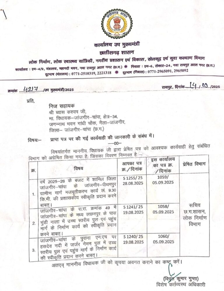 जांजगीर चांपा विधानसभा के विधायक व्यास कश्यप के द्वारा लोक निर्माण विभाग/उपमुख्यमंत्री अरुण साव से जर्जर गेमन पुल की जगह नए पुल, घुंडी नाला में उच्च स्तरीय पुल और जांजगीर से पीथमपुर बाबा कलेश्वर नाथ मंदिर तक रोड निर्माण के लिए स्वीकृति पत्र भेजा गया था। जिसके जवाब में 14 सितंबर 2025 को उपमुख्यमंत्री कार्यालय से विधायक महोदय को आगे की स्वीकृति के लिए अवगत कराया गया है।